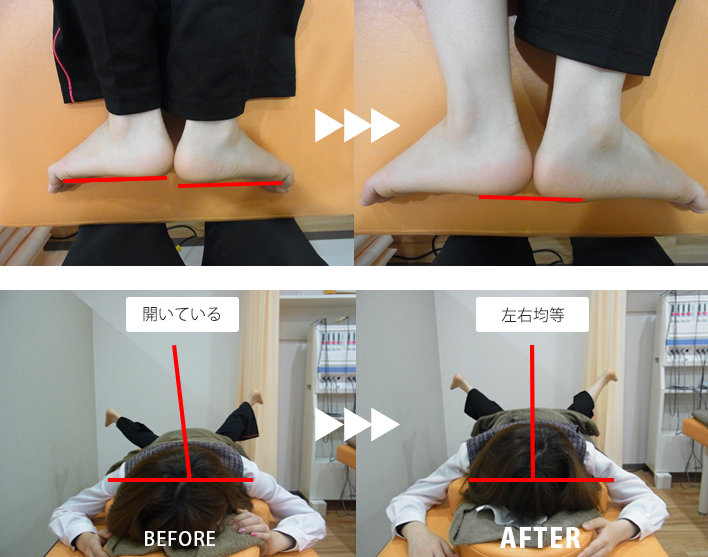 矯正1回目から改善したのですが、完全に改善する為に6回程通院されました。捻じれも改善し、脚長差も無くなりました。ストレッチや運動時の違和感も感じなくなり、楽しく運動を続けられています。