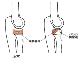 7歳ぐらいの肘関節は、構成する橈骨(とうこつ)という骨の関節端の形状が不完全な形をしており、橈骨を支えている橈骨輪状靱帯 (とうこつりんじょうじんたい)から逸脱しやすくなっています。