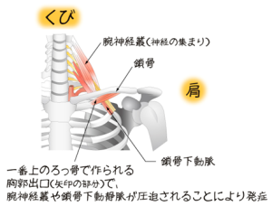 胸郭出口症候群とは、鎖骨や肋骨周辺の筋肉が血管や神経の通り道を圧迫し、肩甲骨周辺や腕・手指にしびれやだるさ、痛み等の症状を起します。