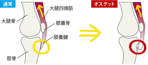 この筋肉は、膝のお皿(膝蓋骨)を介して、脛骨粗面に付着しているので、繰り返しの動作により、付着部分が引っ張られると、炎症が起こります。